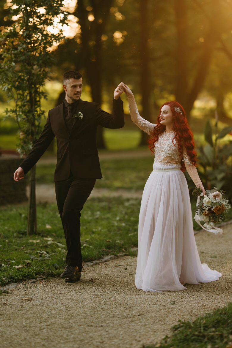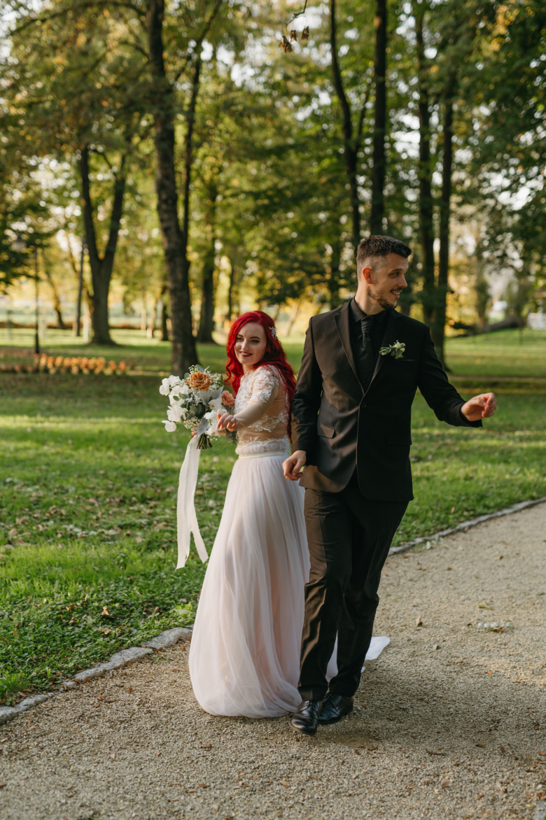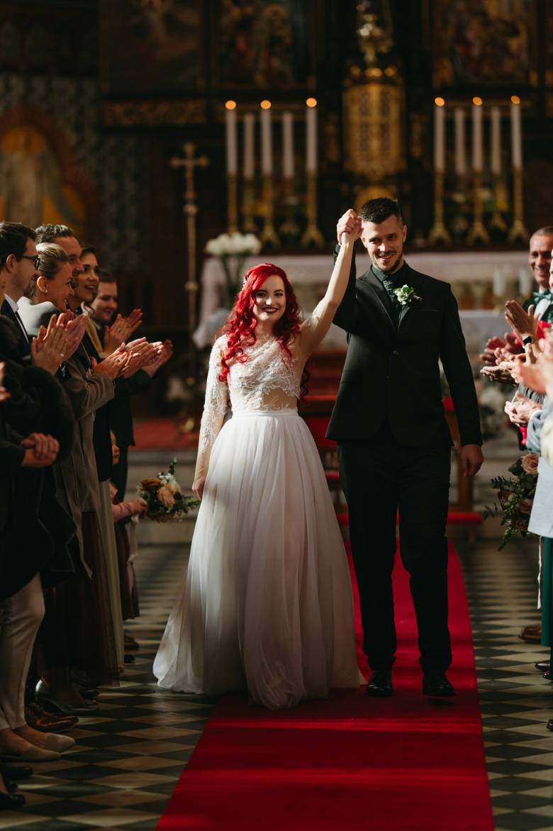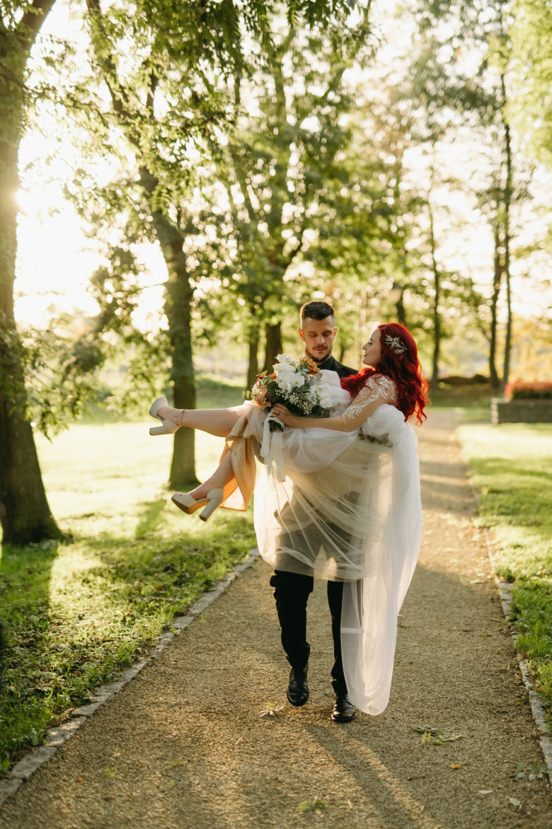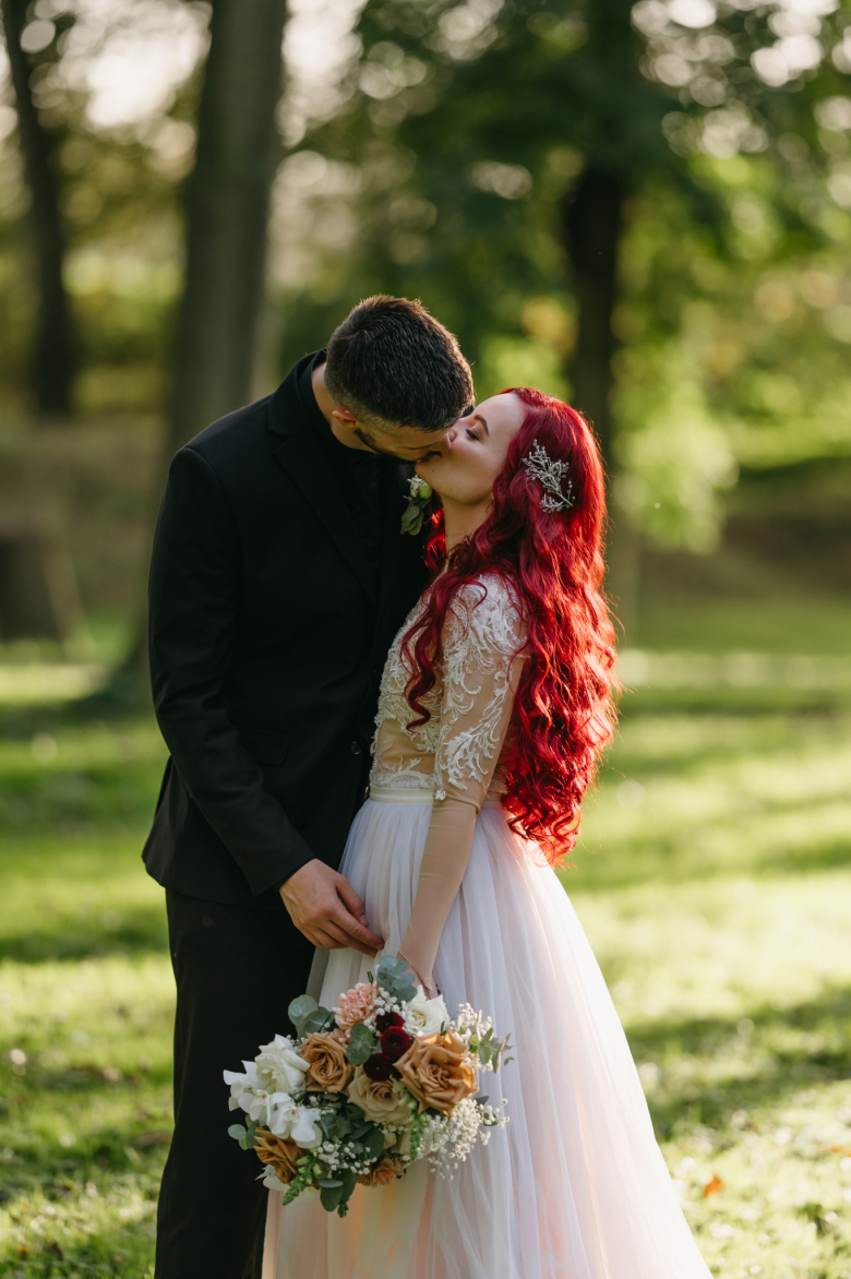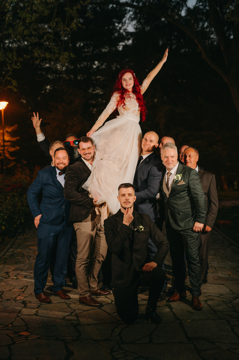 Nikol a David svůj den prožili na nádherném zámku Chałupki v Polsku, kde na ně dýchala historie i elegance na každém kroku. Po krásném obřadu v kostele následovala květinami provoněná hostina plná jemnosti a detailů. Nevěsta v šatech šitých na míru talentovanou švadlenkou Hanou Matyášovou vypadala jako z obrazu – její rudé vlasy a dokonale sladěná rtěnka dodaly celému dni kapku nezaměnitelného kouzla. Pojďte si prohlédnout fotky a nechte se vtáhnout do této atmosféry:).